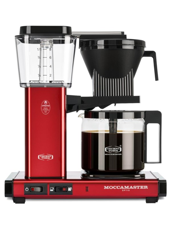 Vi har fundet Moccamaster Optio Red Metallic fra Moccamaster hos Proshop.dk i kategorien Kaffe Og Espresso. – 1520 watt- Håndsamlet og individuelt testet- 2 separate varmelegemer- Tragtholder- Automatisk drypstop- Kalkindikator- Slukker automatisk efter 40 minutter- Vippelåg med integreret blanderør- Kontakt til regulering – halv kande/hel kande- ECBC certifice